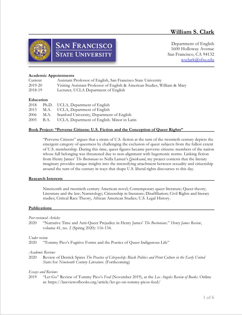 Will Clark is an Assistant Professor in English Department at San Francisco State University. His research, writing, and teaching connect U.S. literary studies, queer studies, and critical race theory. Across his work, he emphasizes the ways in which historical formations around sexuality, race, gender, and nationality contextualize how we understand social, legal, and literary movements in the present.